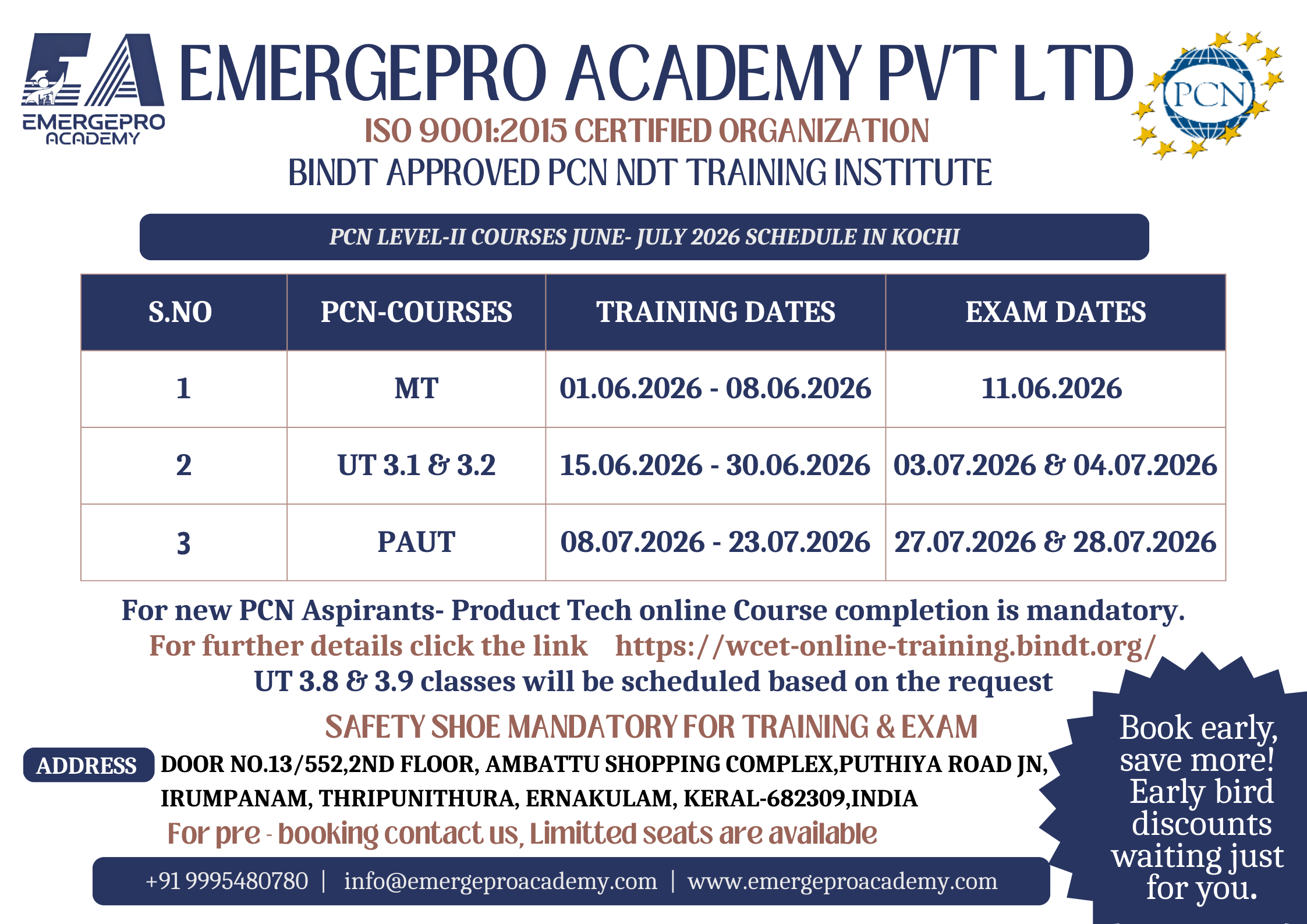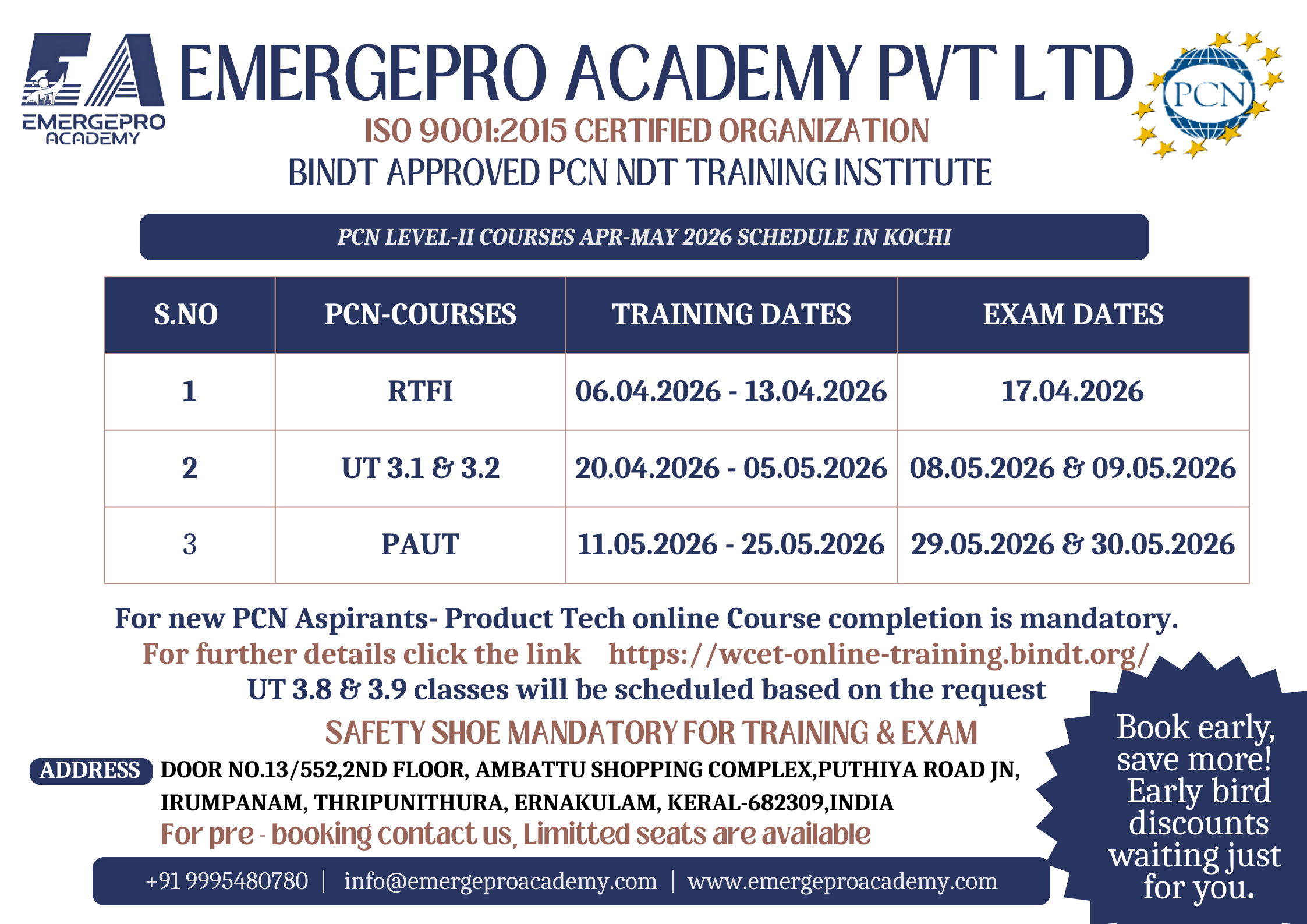 We are delighted to share that Emergepro Academy (EA) has officially received Approval for Training Organization(ATO) status from BINDT. Starting in 2026, EA will proudly offer specialized training programs in PAUT, TOFD,UT,ET,MT,PT, and RTFI Level 2 at our Kochi campus.